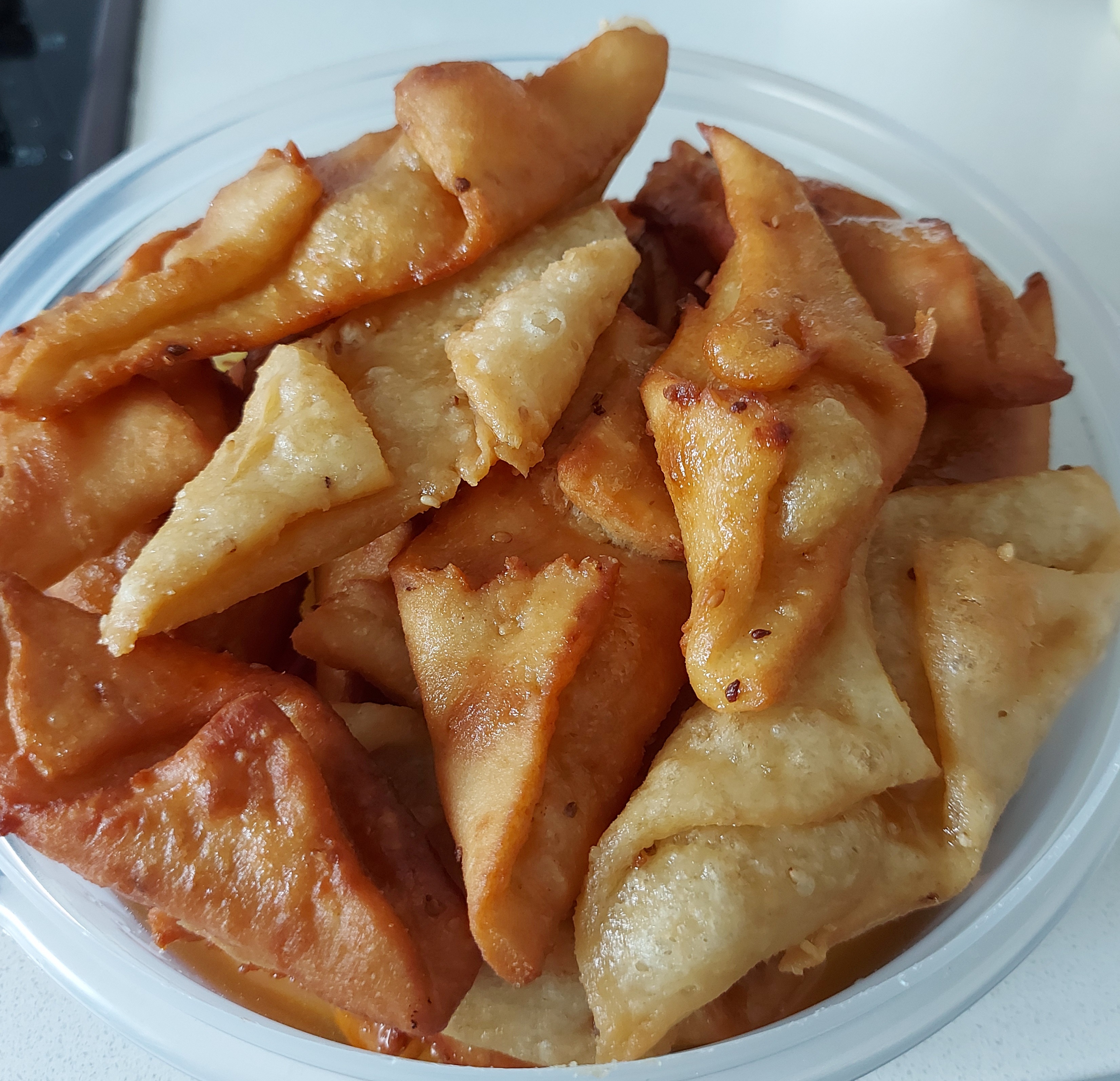 Ponemos un poco de harina en una superficie plana, estiramos la masa con un rodillo, cortamos rectángulos de aproximadamente 5 cms de largo, doblamos un pico de arriba y otro de abajo del lado opuesto y cerramos en el centro (sellados la unión con los dedos húmedos de agua para que no se abran al freirlos)